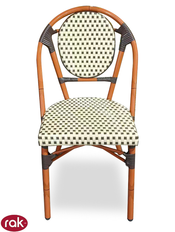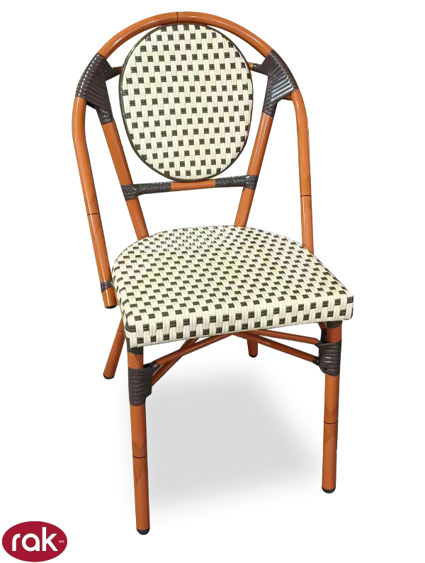 SILLA IMPORTADA MARCA RAK, ESTRUCTURA REFORZADA EN ALUMINIO PINTURA ACABADO RATTAN, ASIENTO Y RESPALDO TEJIDOS EN PVC MOD. BISTRO-ALU IDEAL PARA CAFETERIAS Y RESTAURANTES EN INTERIOR O EXTERIOR.